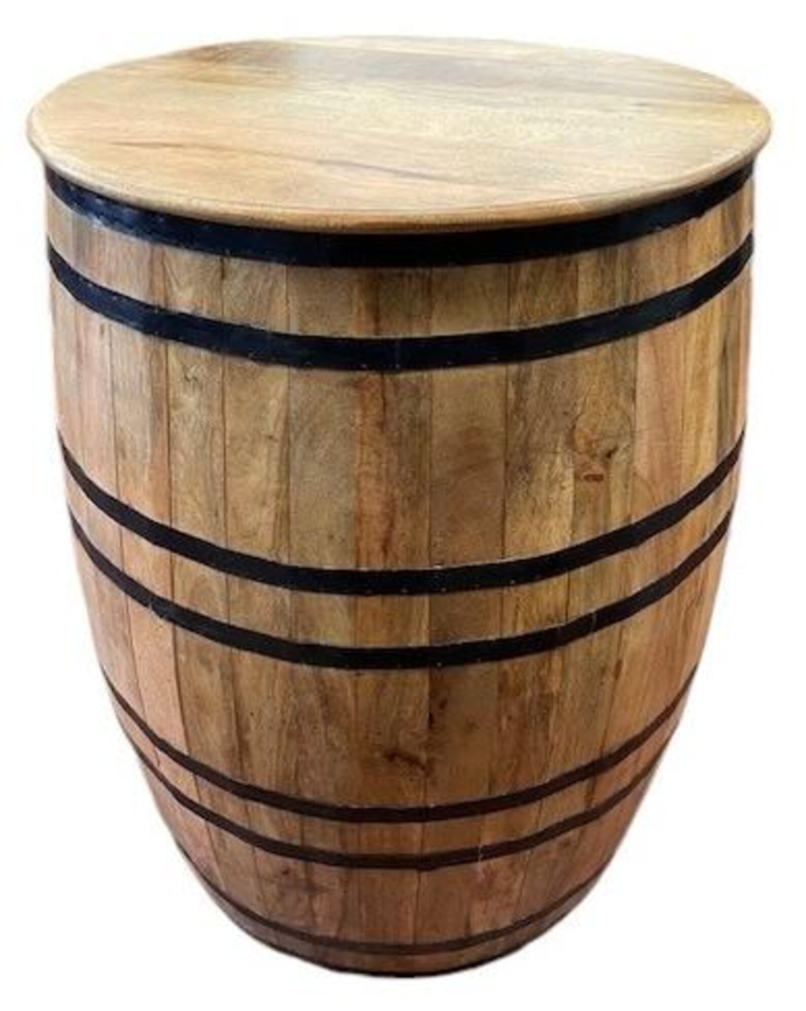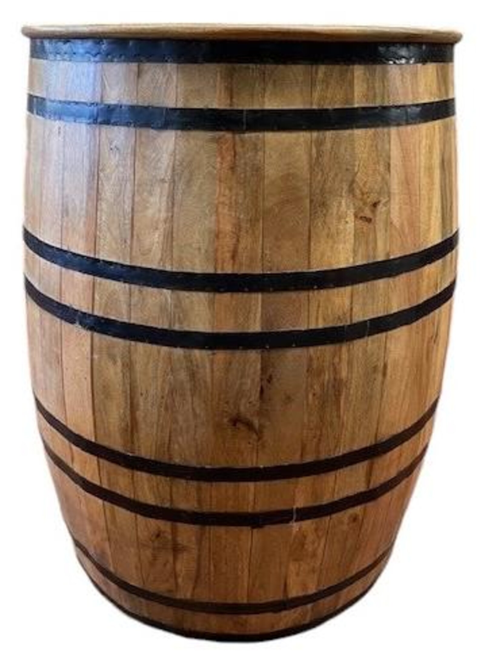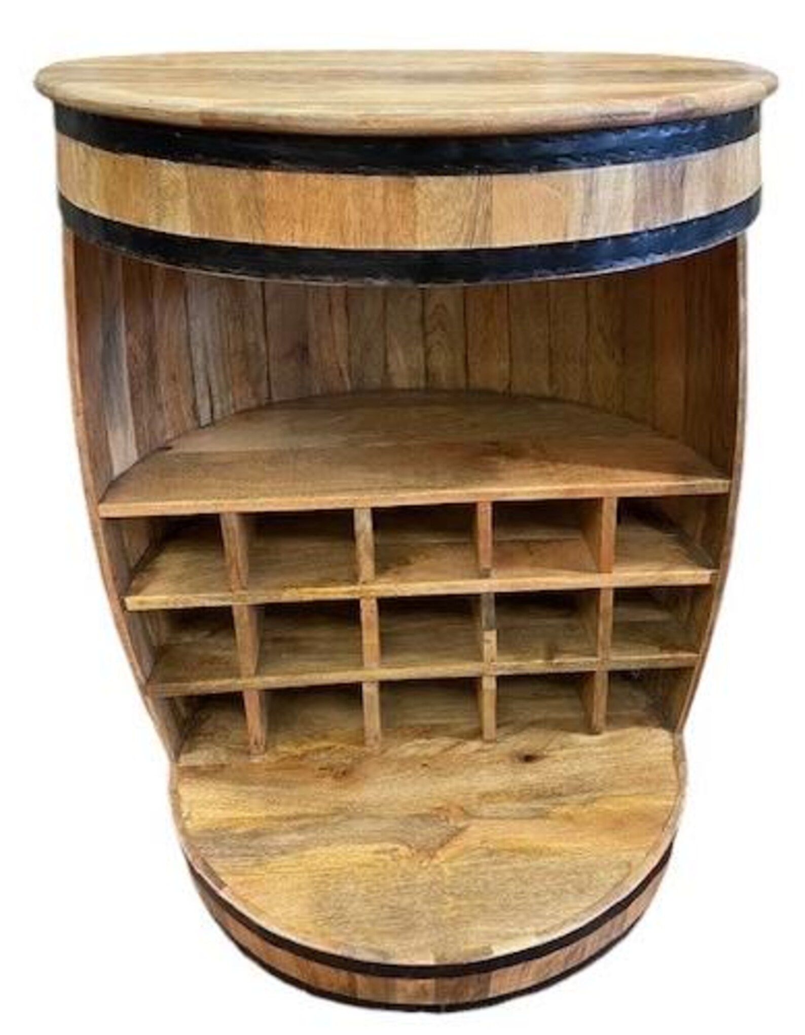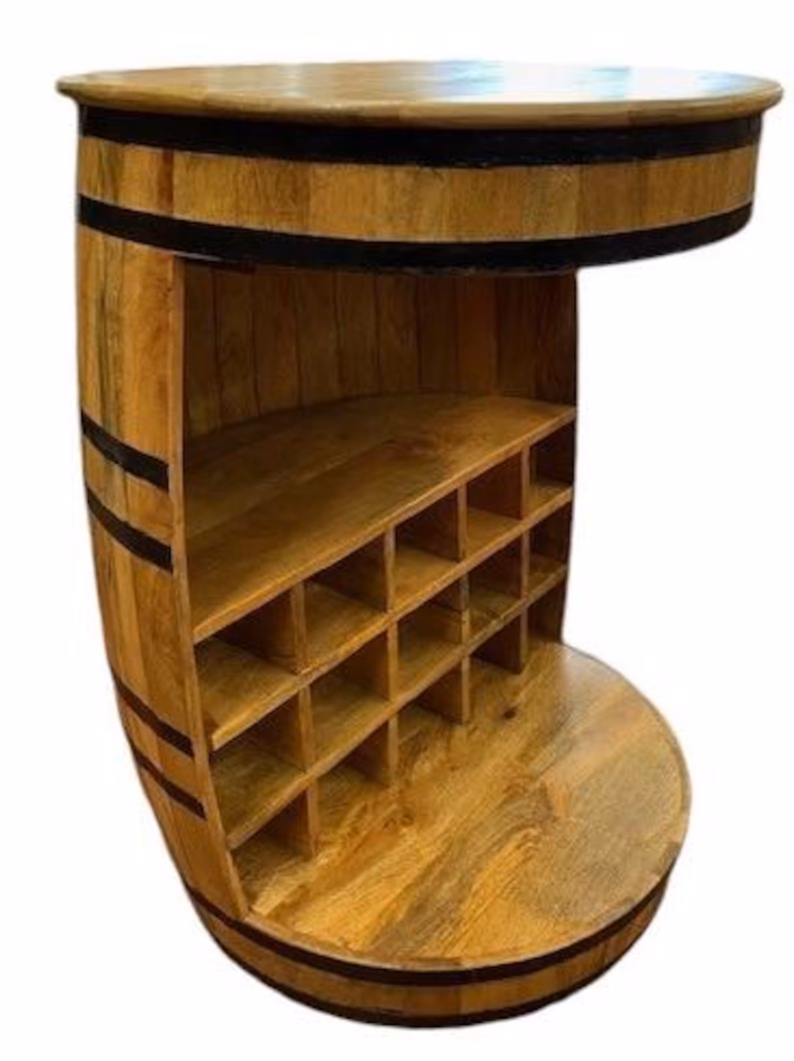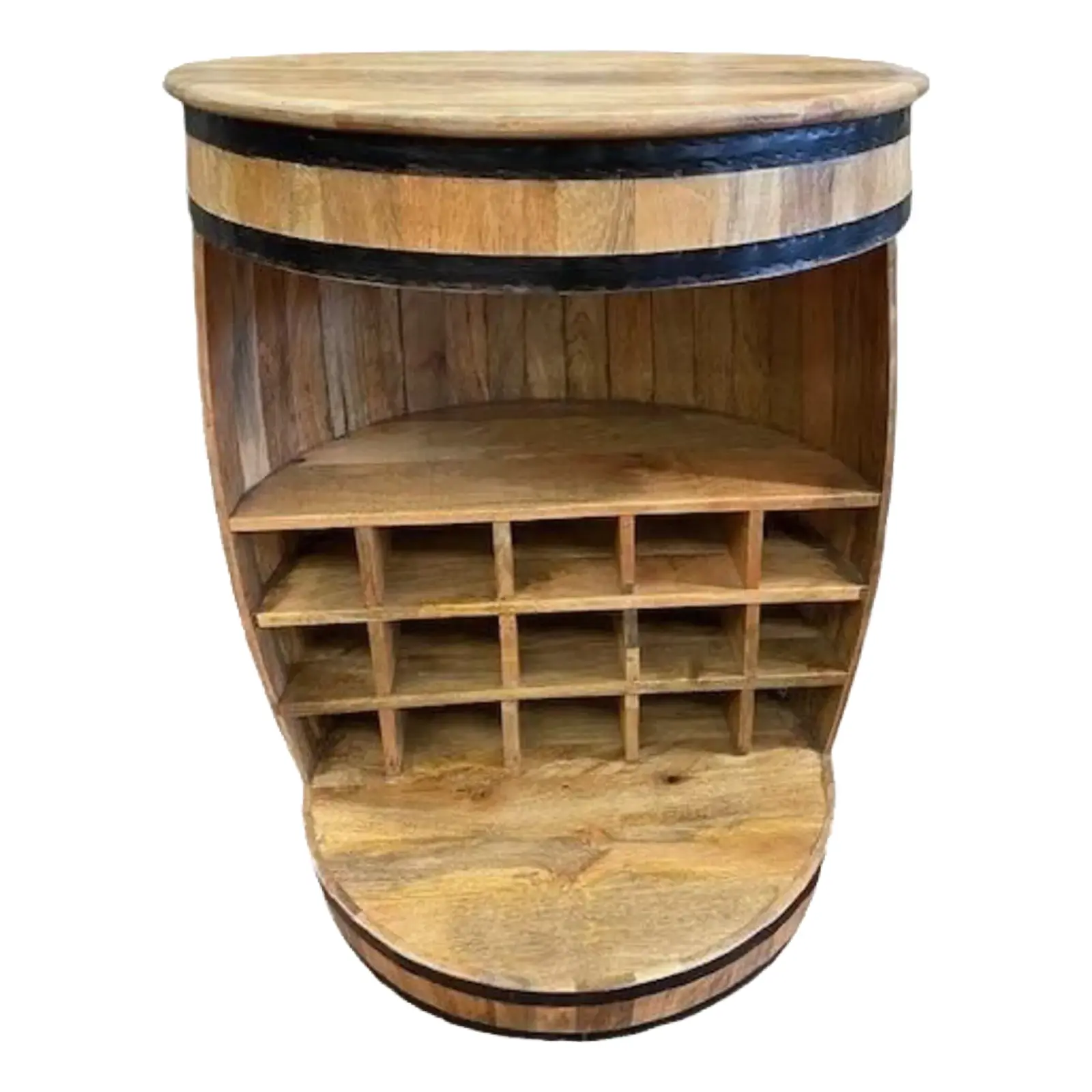 The Rustic Half-Barrel Wine Bar Cabinet features a round countertop and solid mango wood construction, perfect for home entertaining.
