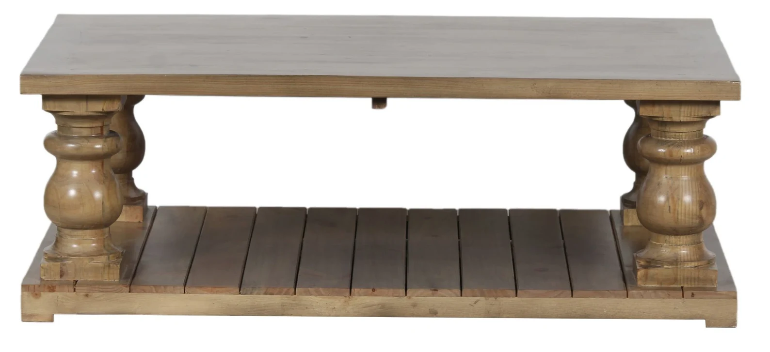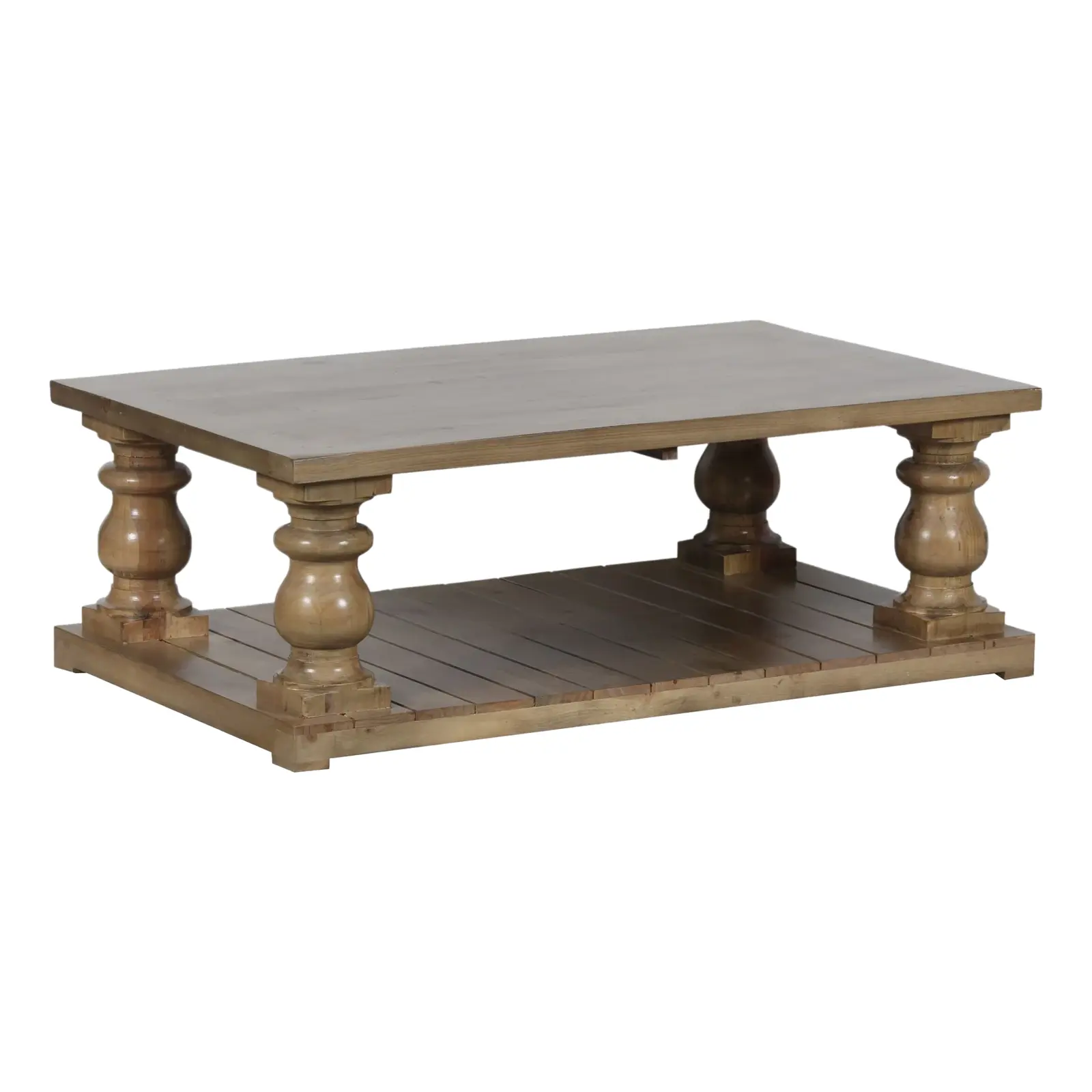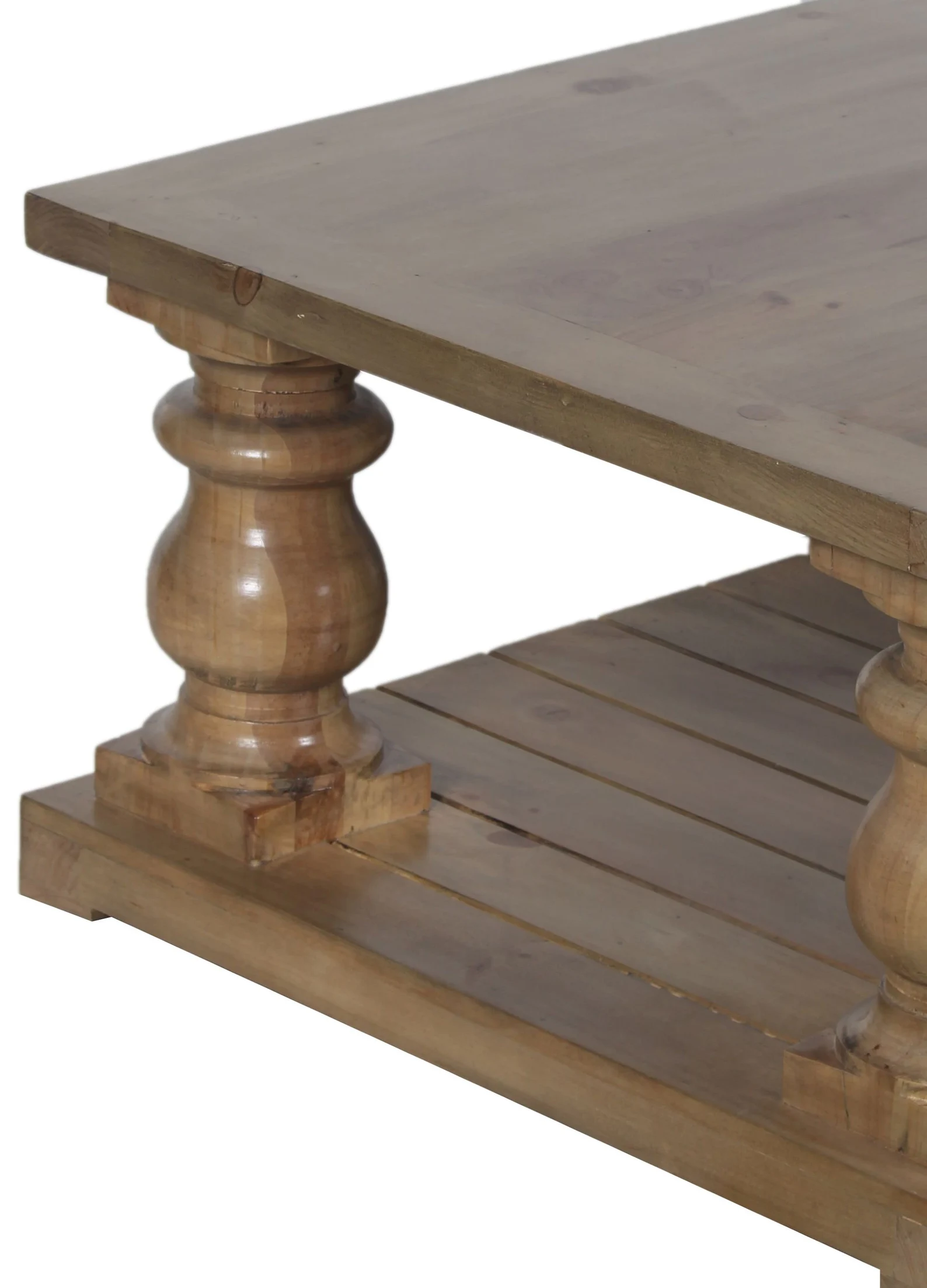 This rustic large square living room coffee table is crafted from solid New Zealand Pine with chunky baluster legs and a slatted floor shelf in a natural finish.
