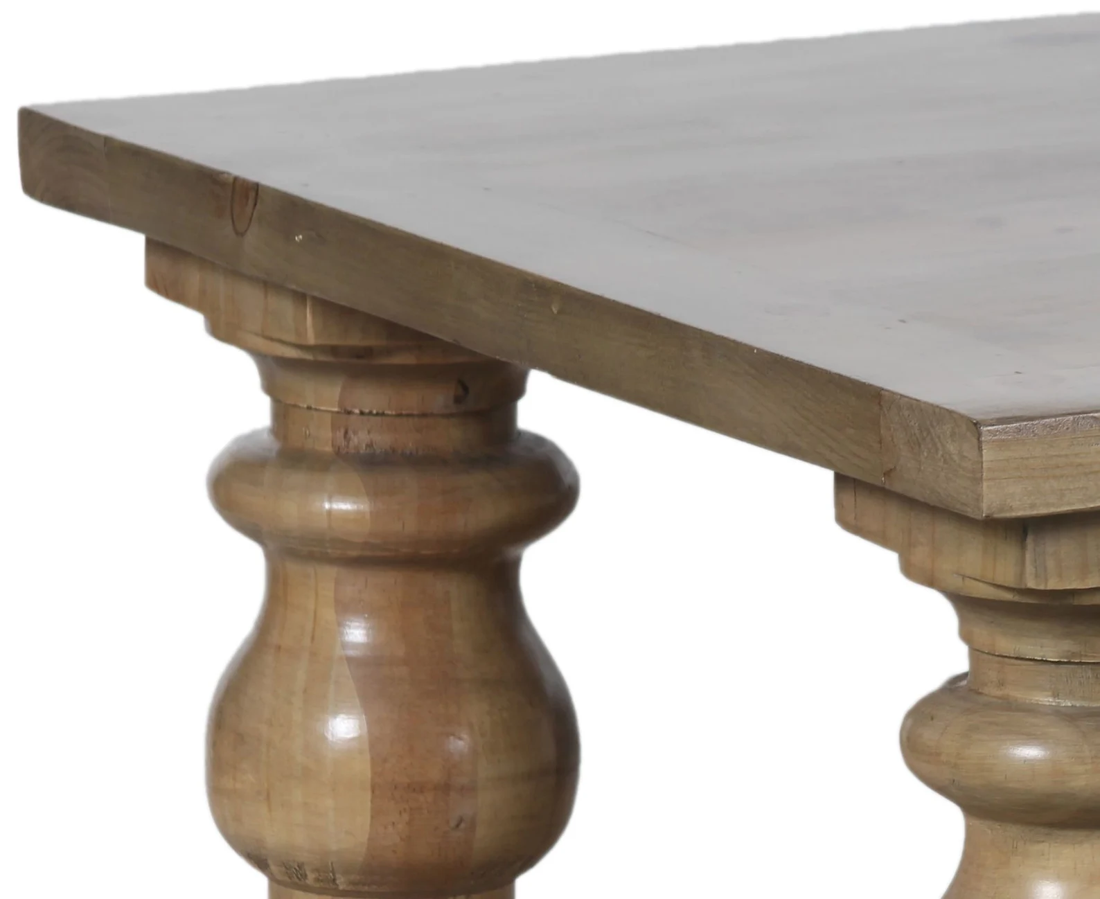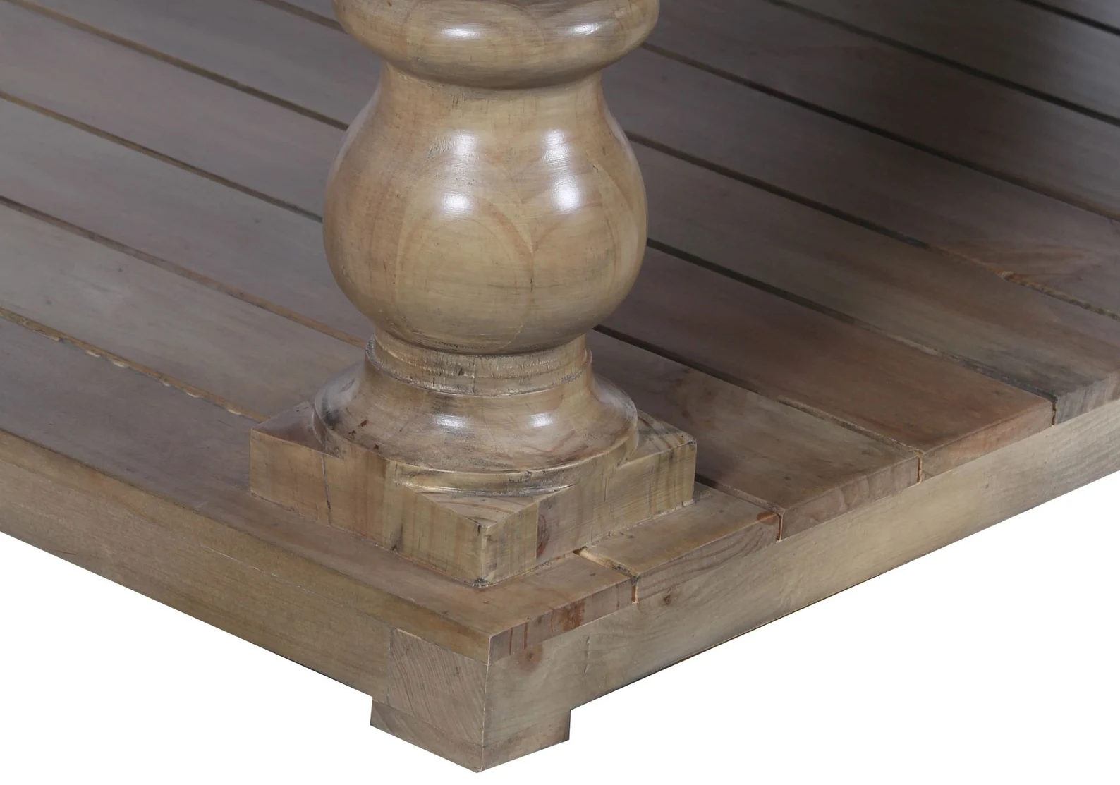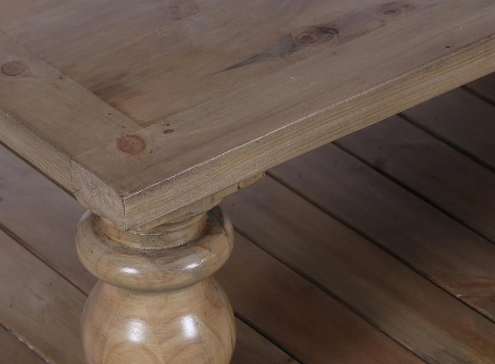 This rustic large square living room coffee table is crafted from solid New Zealand Pine with chunky baluster legs and a slatted floor shelf in a natural finish.