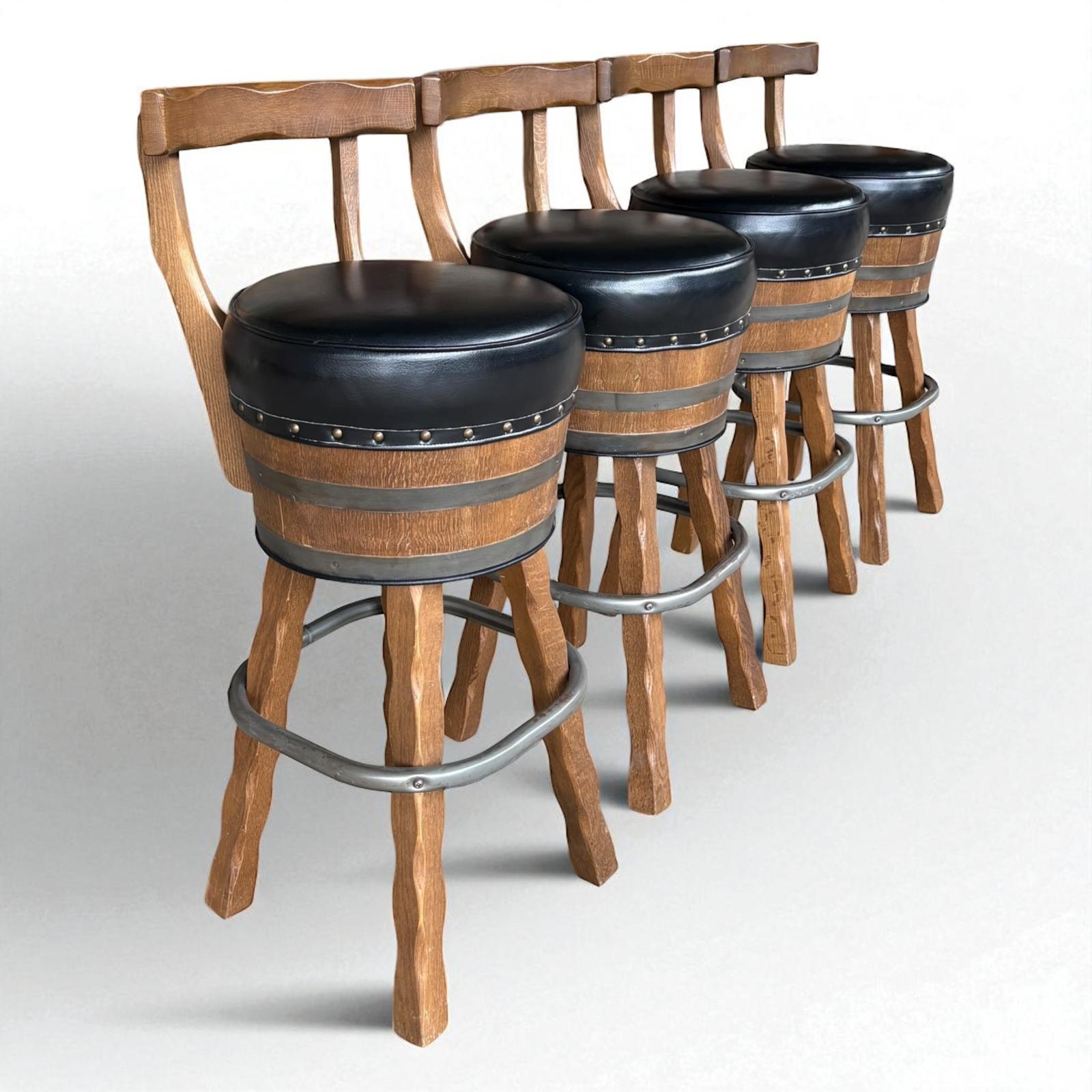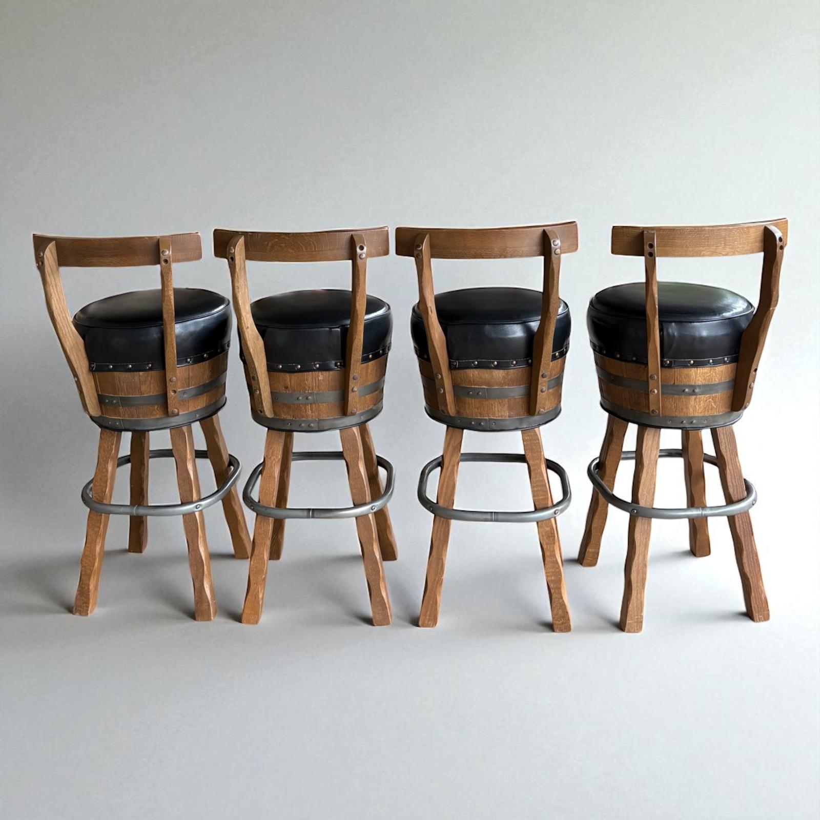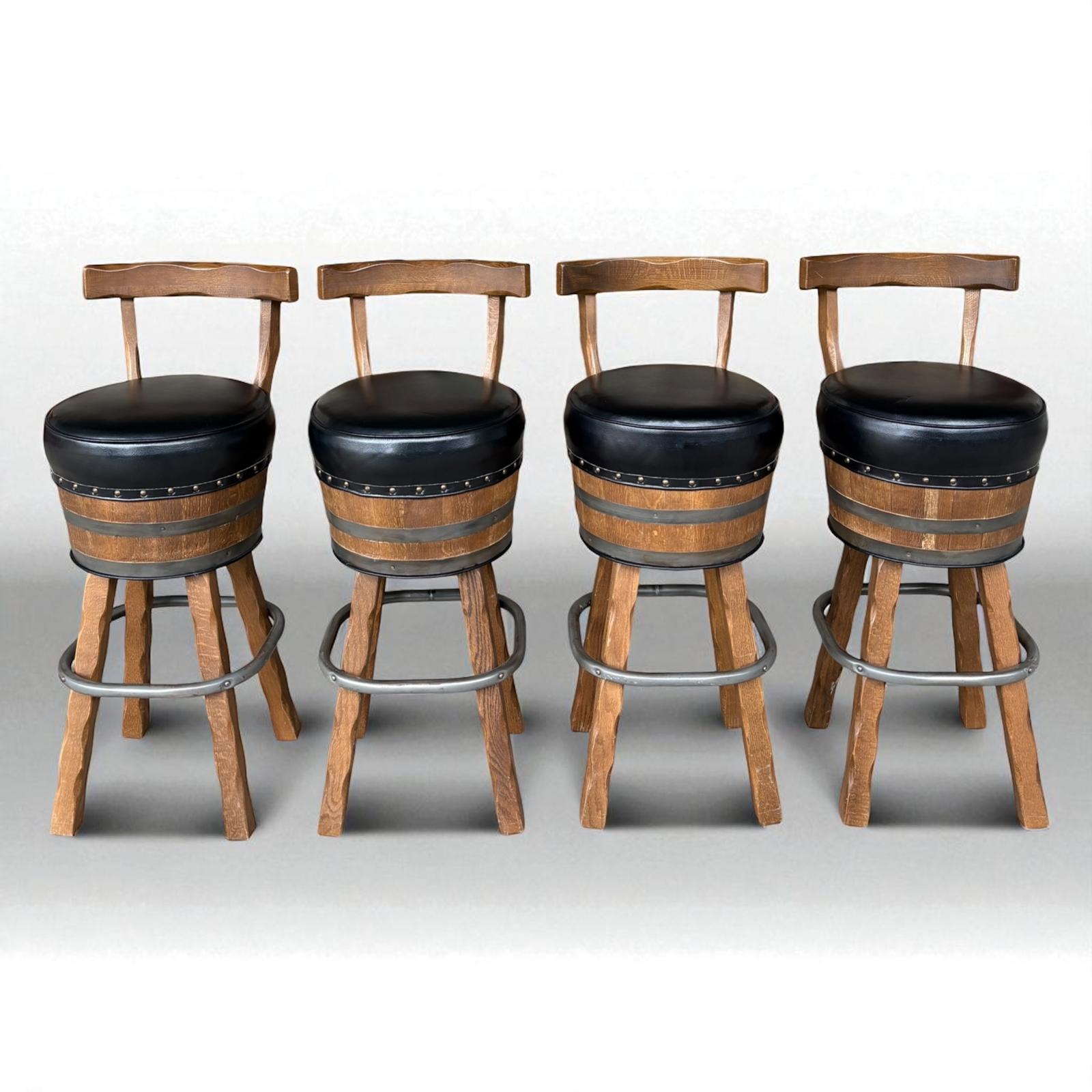 Bring rustic sophistication and timeless craftsmanship into your home with this striking set of four barrel-style bar stools. Each vintage stool is beautifully designed with a rich oak wood base crafted to mimic the look of a classic whiskey barrel, complete with metal banding for an authentic touch. The seats are upholstered in smooth black leather with nailhead trim.