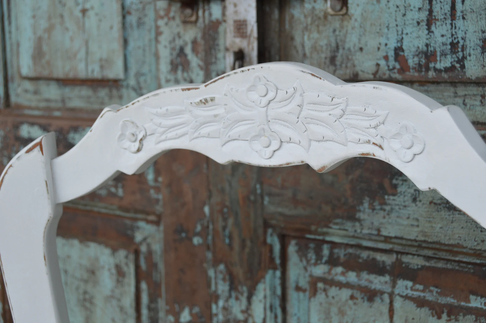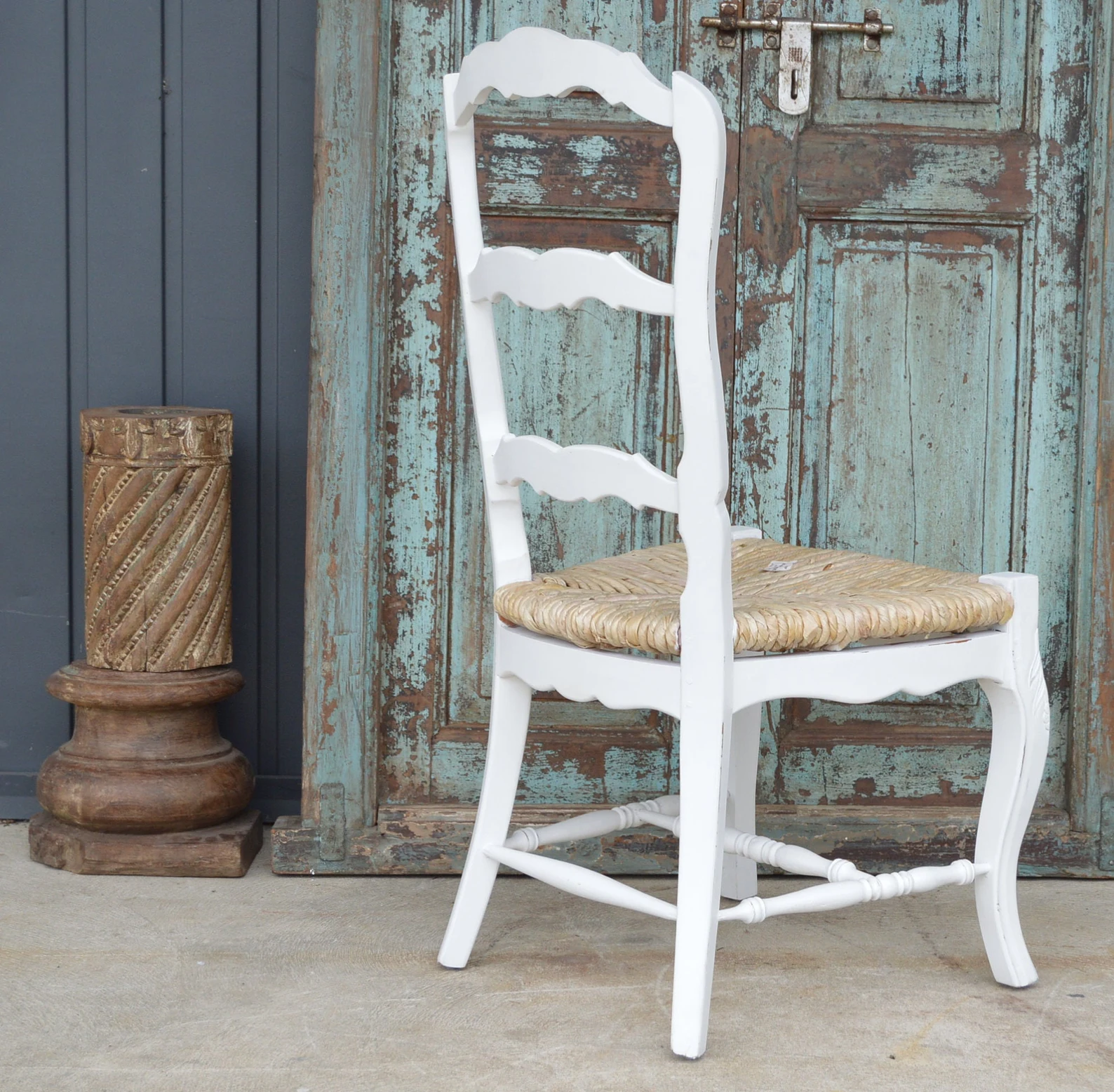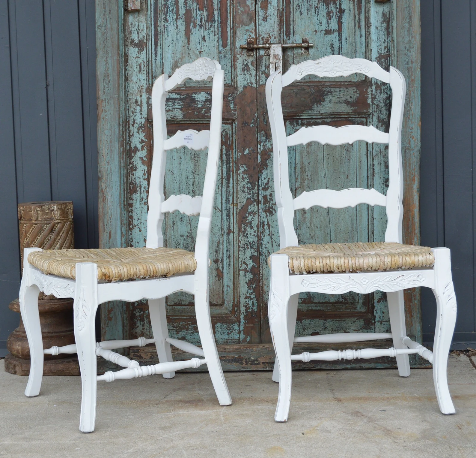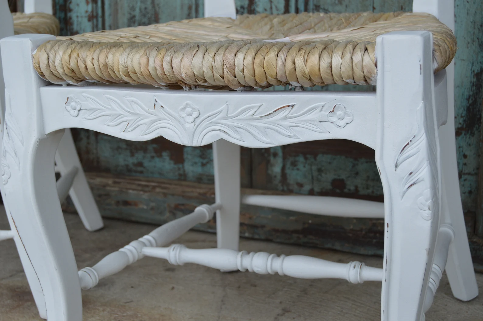 This set of four white French Provincial dining accent side chairs features hand-carved solid wood, rush seats, and a tall ladder back, offering a rustic country farmhouse style.