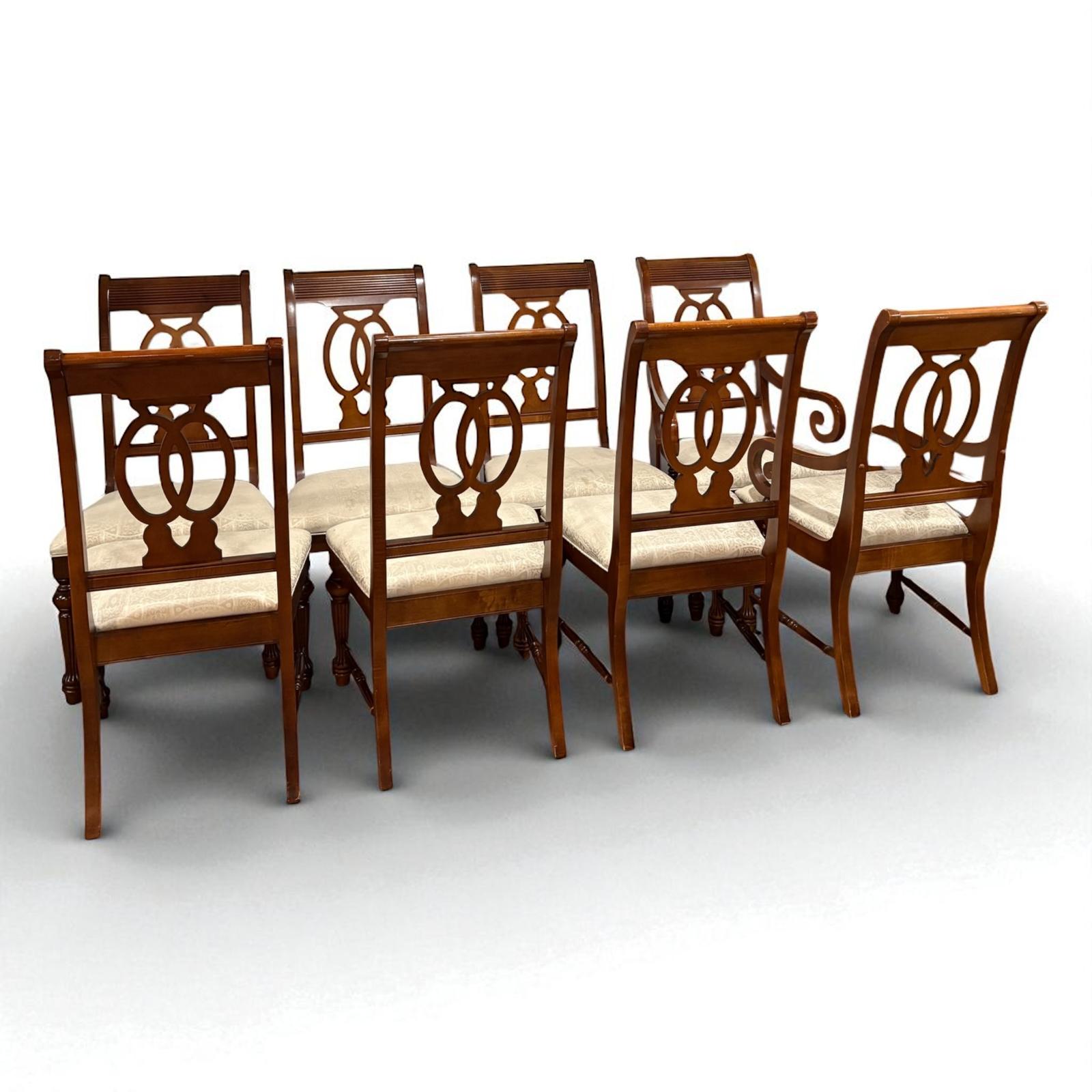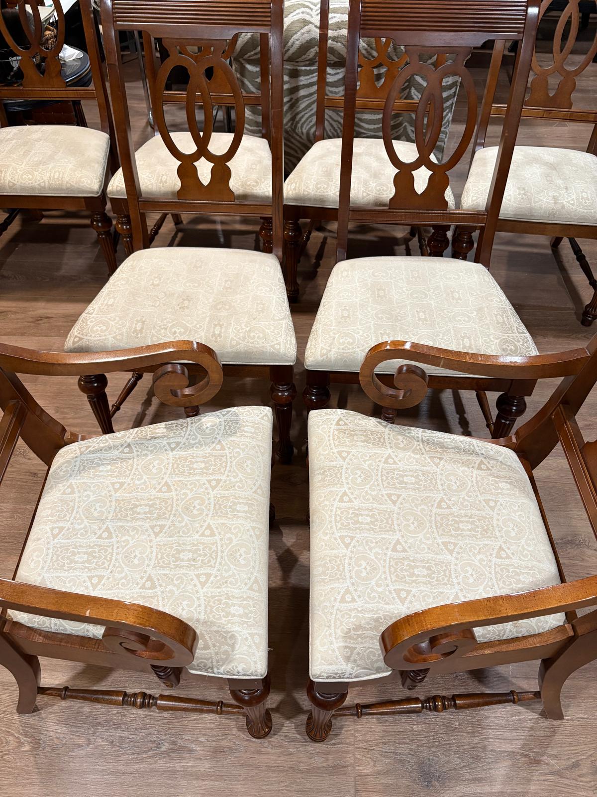 Elegant set of 8 traditional dining chairs. Wood frames with cream color neutral custom upholstered seats. These chairs feature beautifully carved details, turned front legs, and a refined double oval back design. The set includes 2 armchairs with graceful scroll arms and 6 side chairs, offering both comfort and sophistication. A few of the seats have some minor marks from use only one has a significant mark on it (photo included). Legs have some minor signs of use please look at photos.