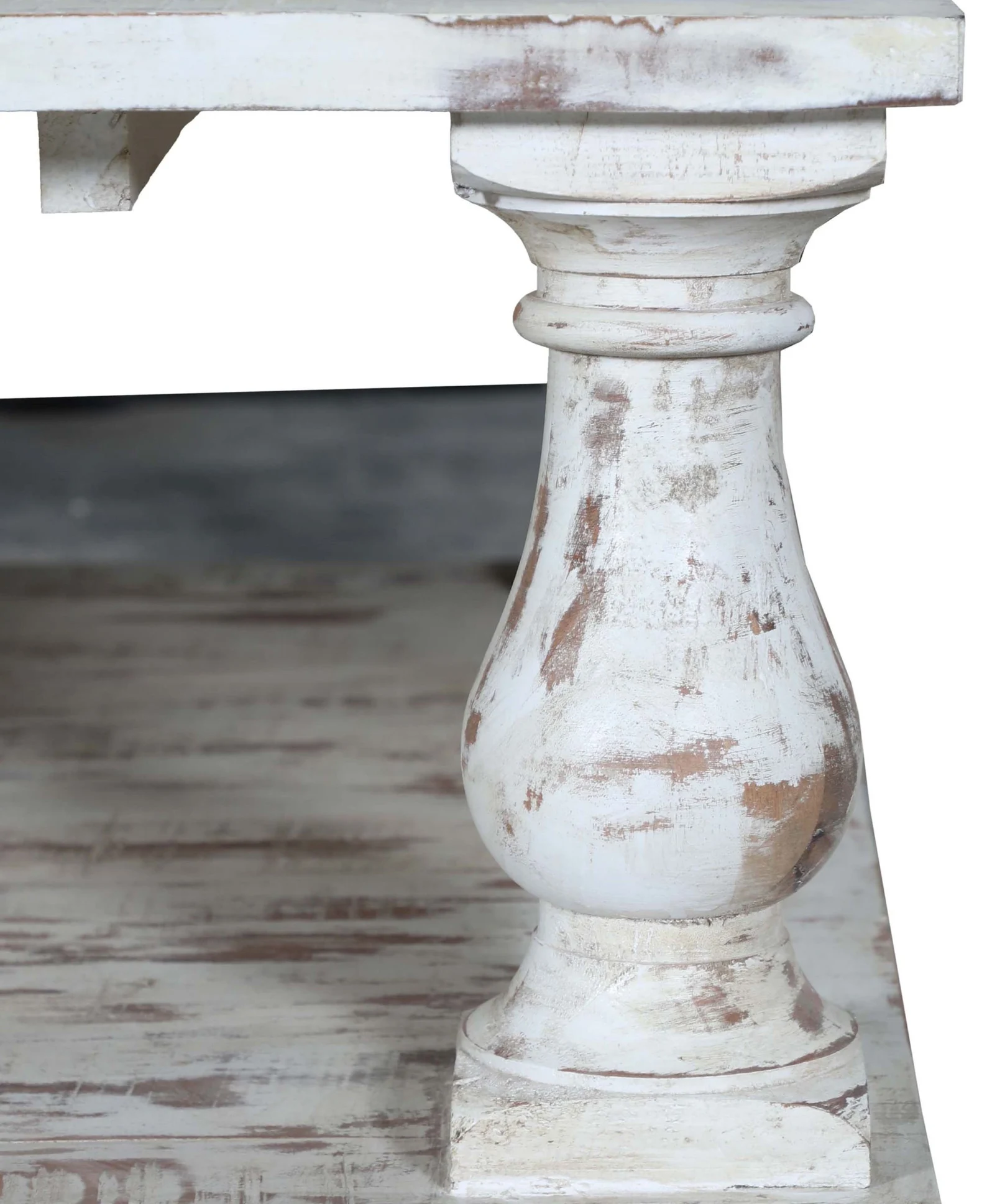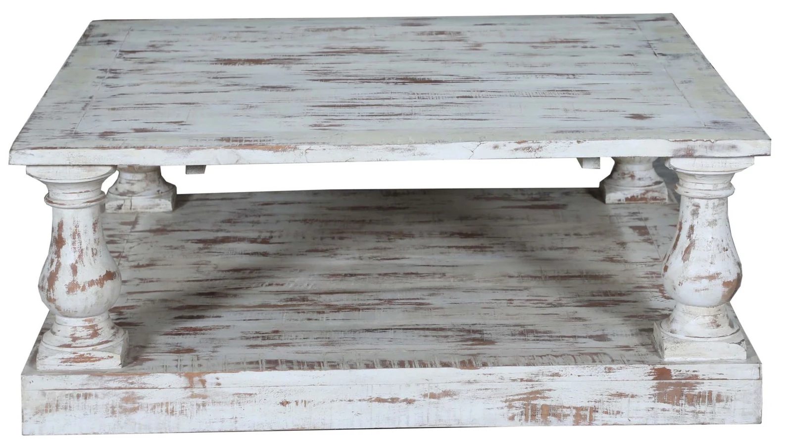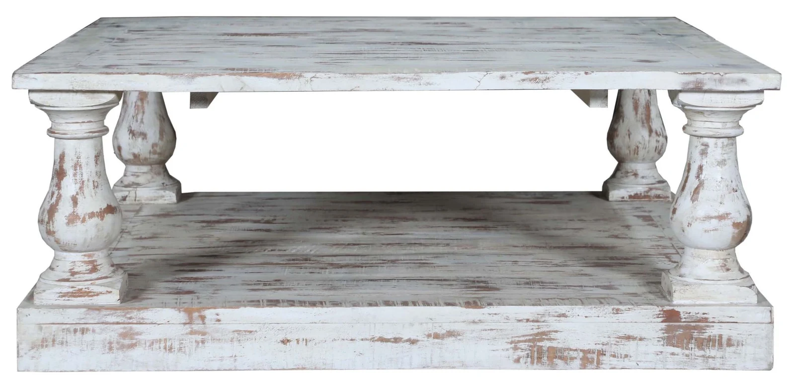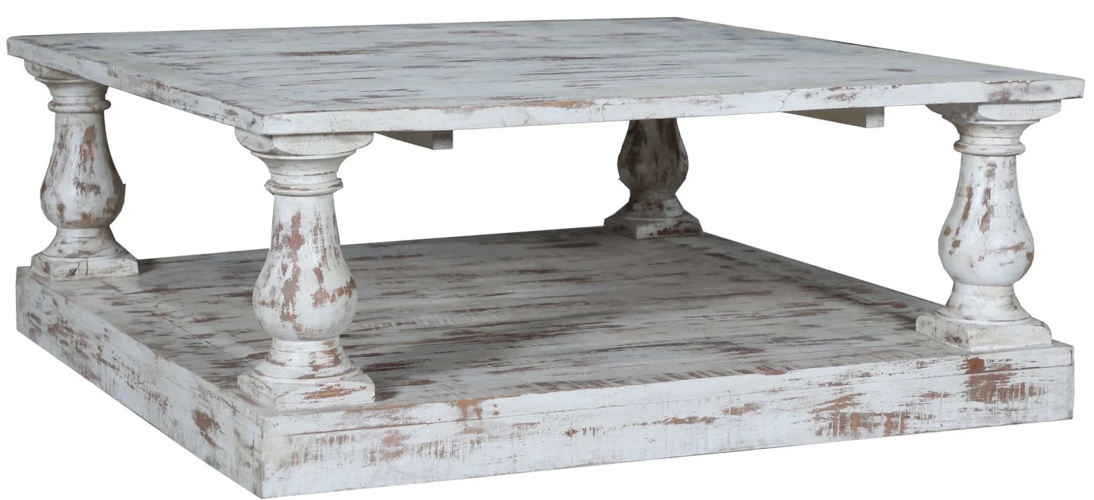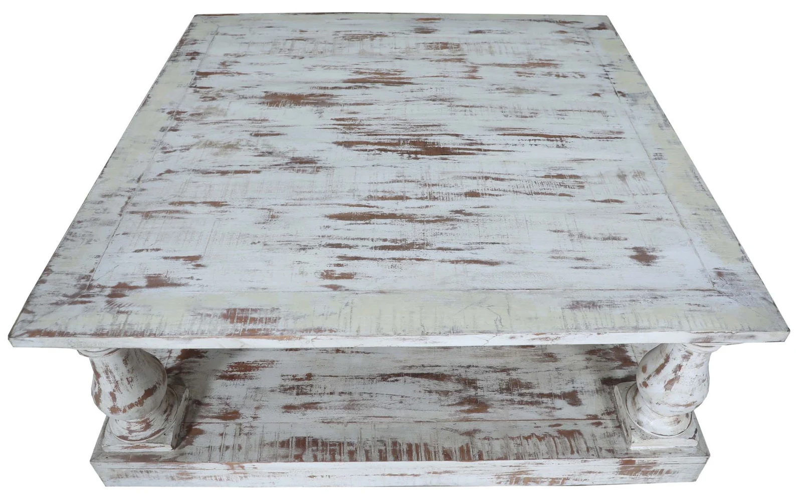 This shabby chic whitewashed oversized coffee table features two tiers and chunky baluster legs, crafted from solid wood, offering a rustic square cocktail table with a slatted floor shelf for a living room.