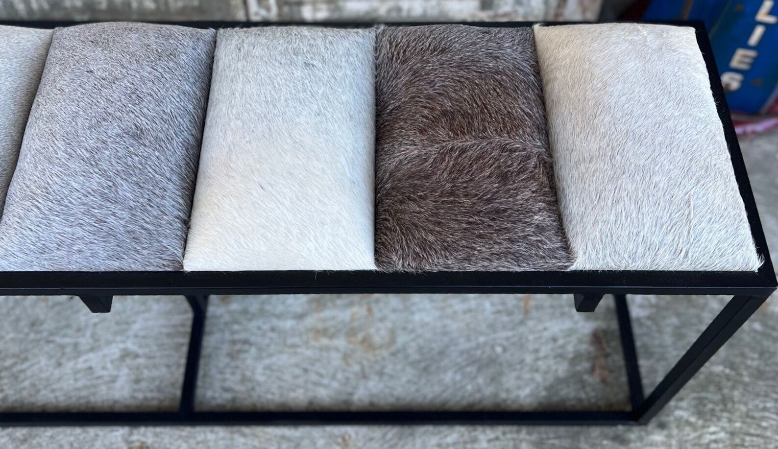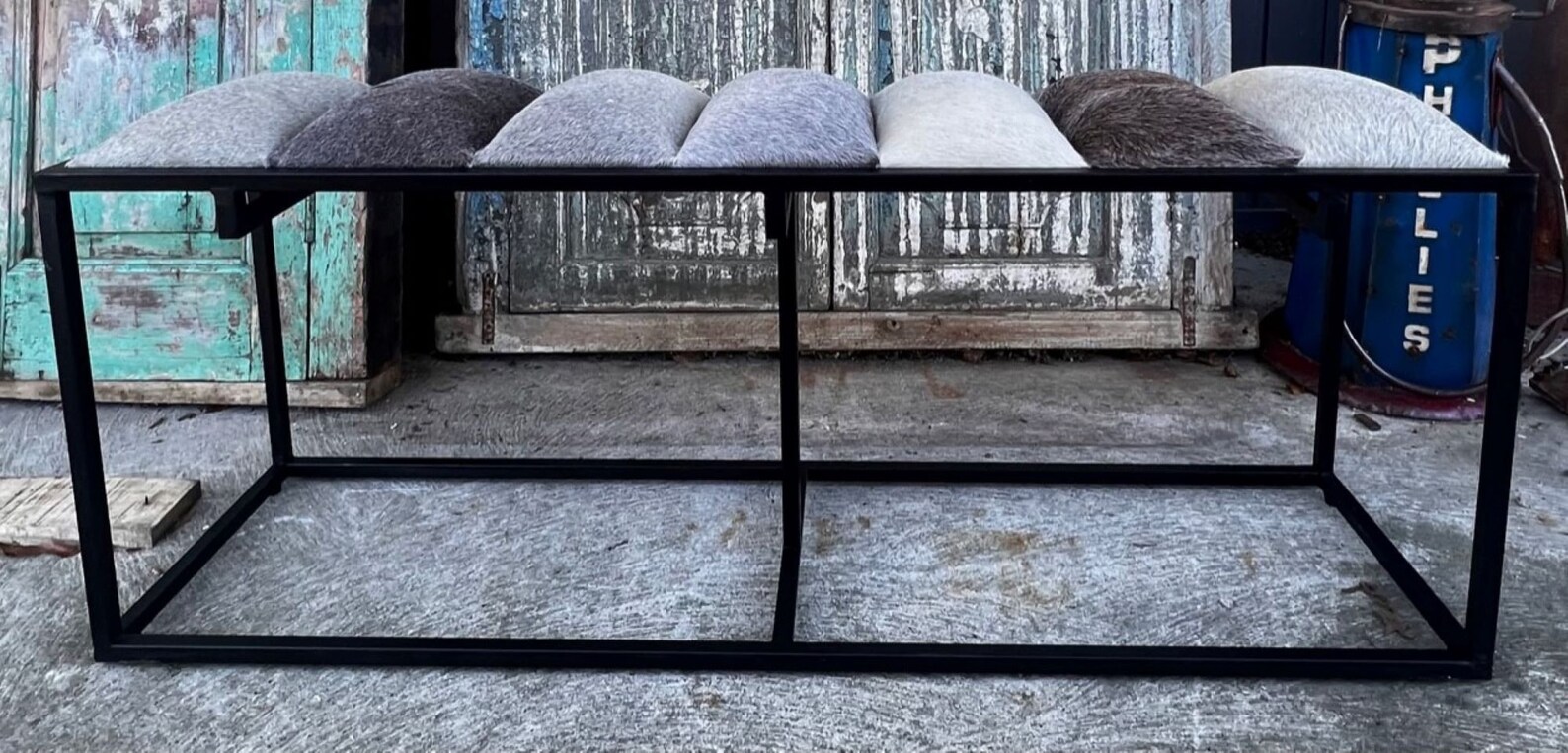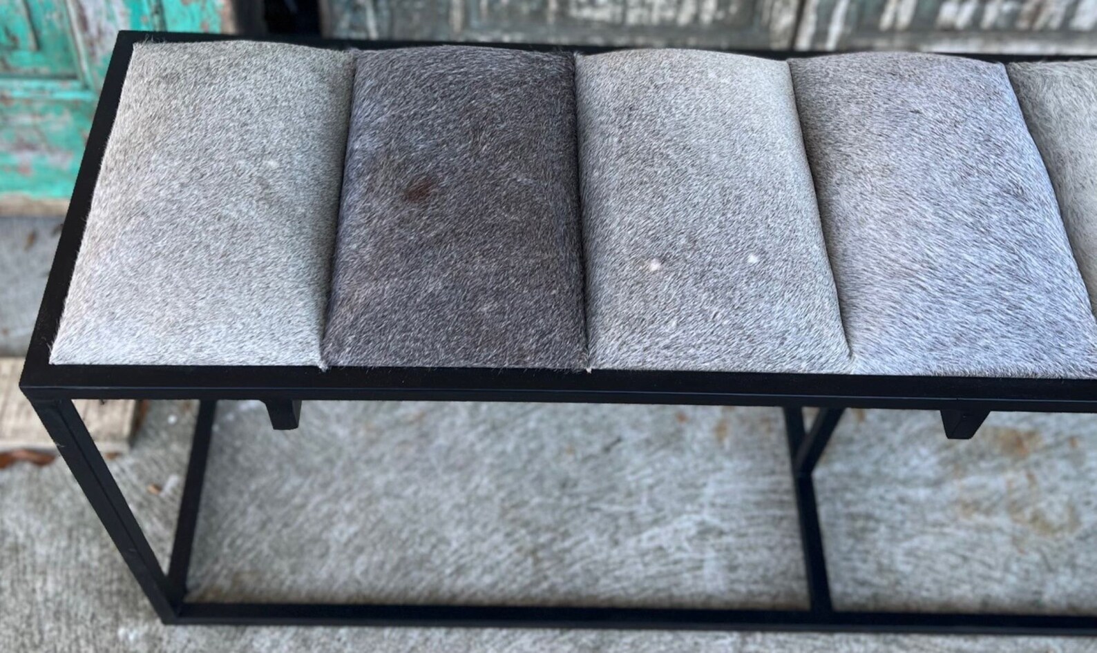 This Southwestern Rustic Ranch House bench features a long iron frame with rustic hair-on-hide cushions, perfect as an entryway, end-of-bed, or long dining bench.
