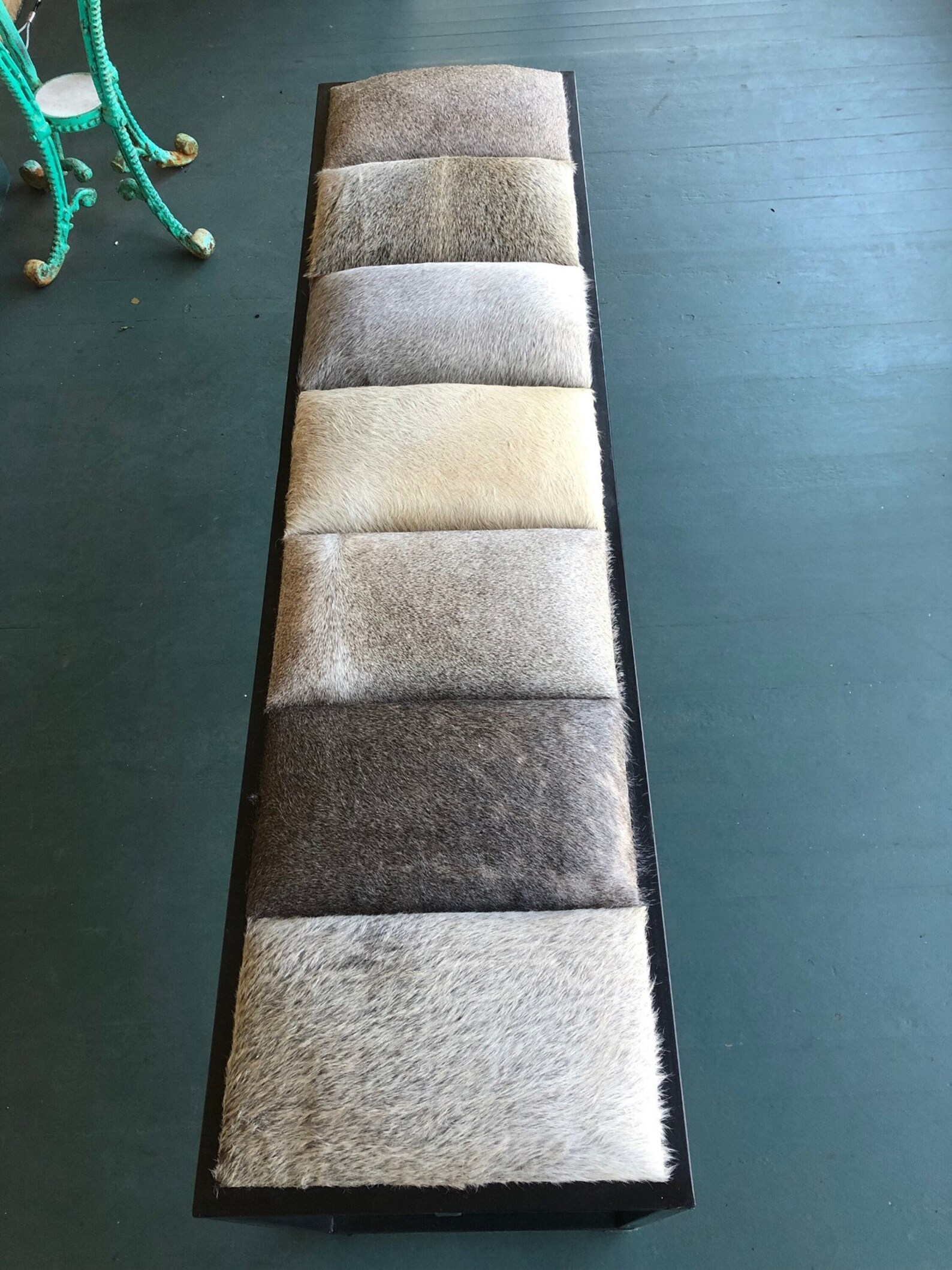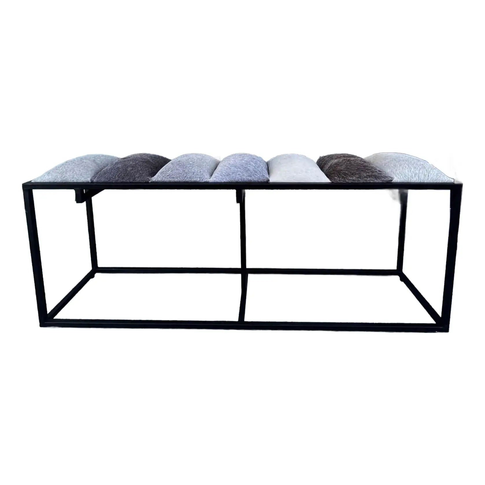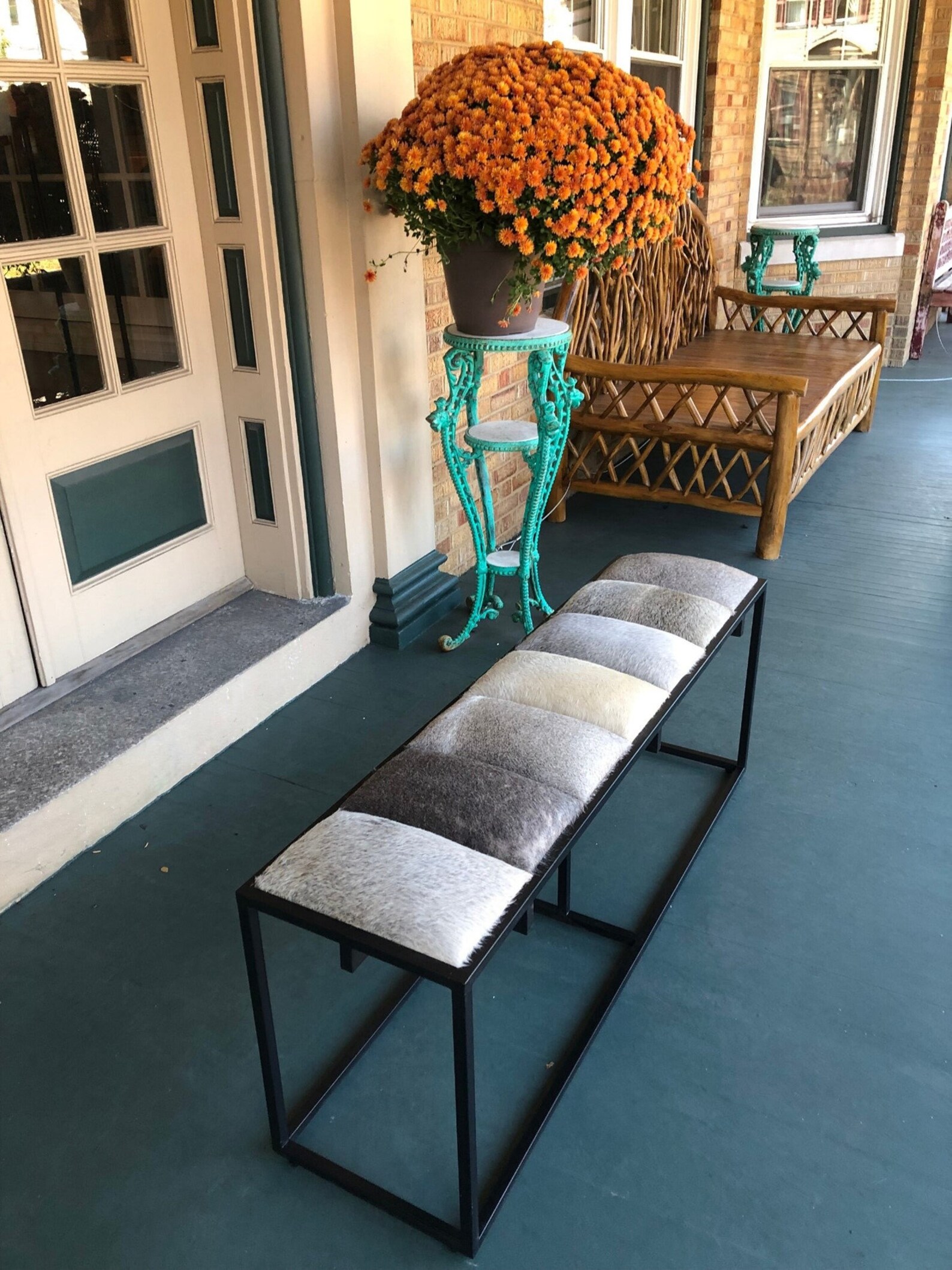 This Southwestern Rustic Ranch House bench features a long iron frame with rustic hair-on-hide cushions, perfect as an entryway, end-of-bed, or long dining bench.