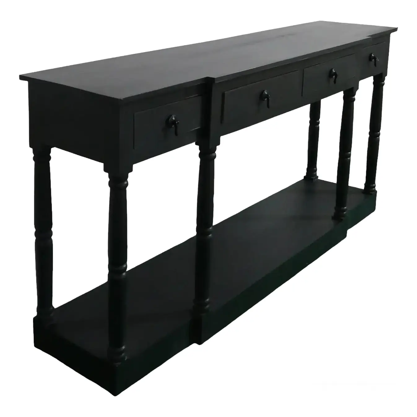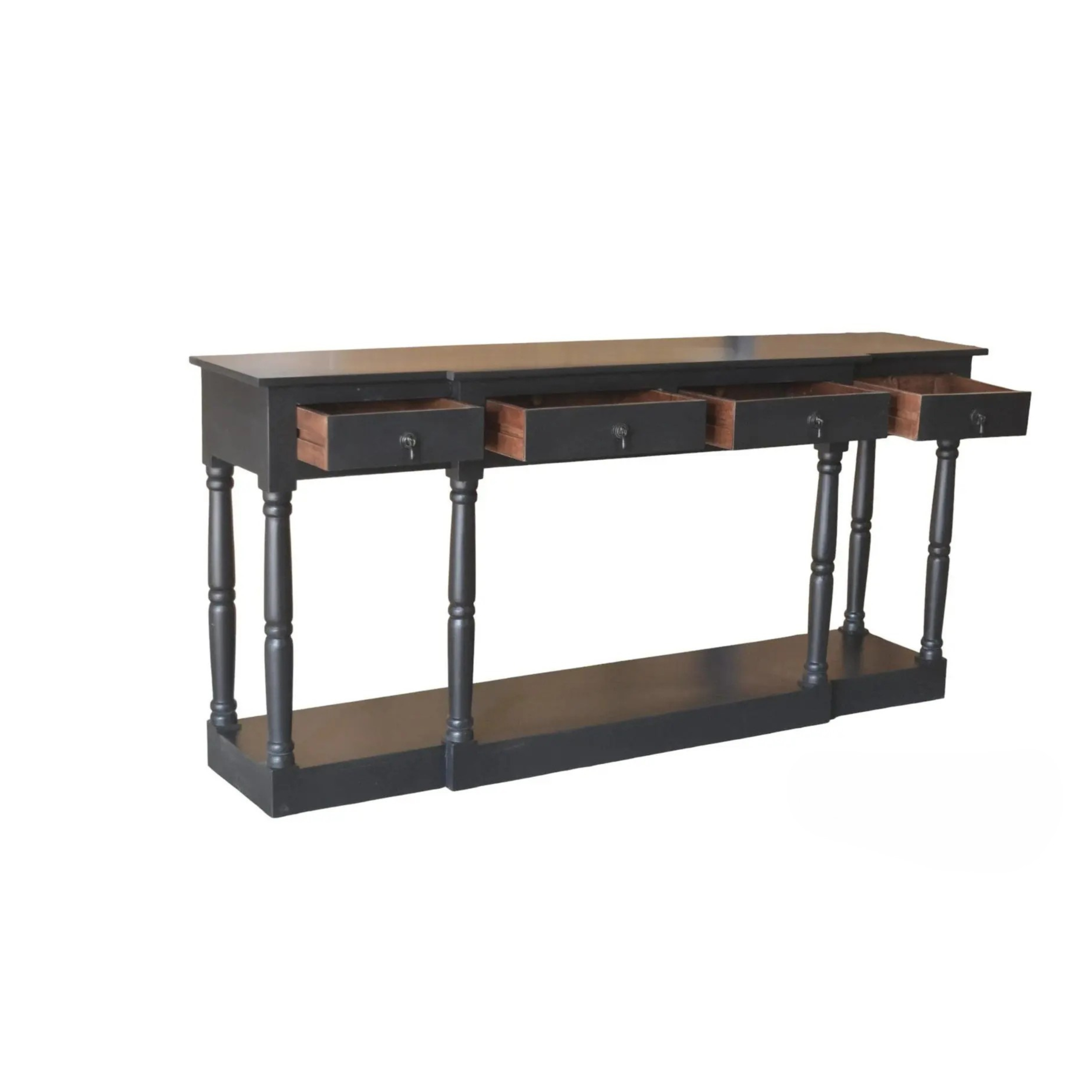 This traditional breakfront console features four drawers and a bottom shelf, crafted from modern black solid wood, offering a 71-inch long sofa table perfect for an entryway or hallway.