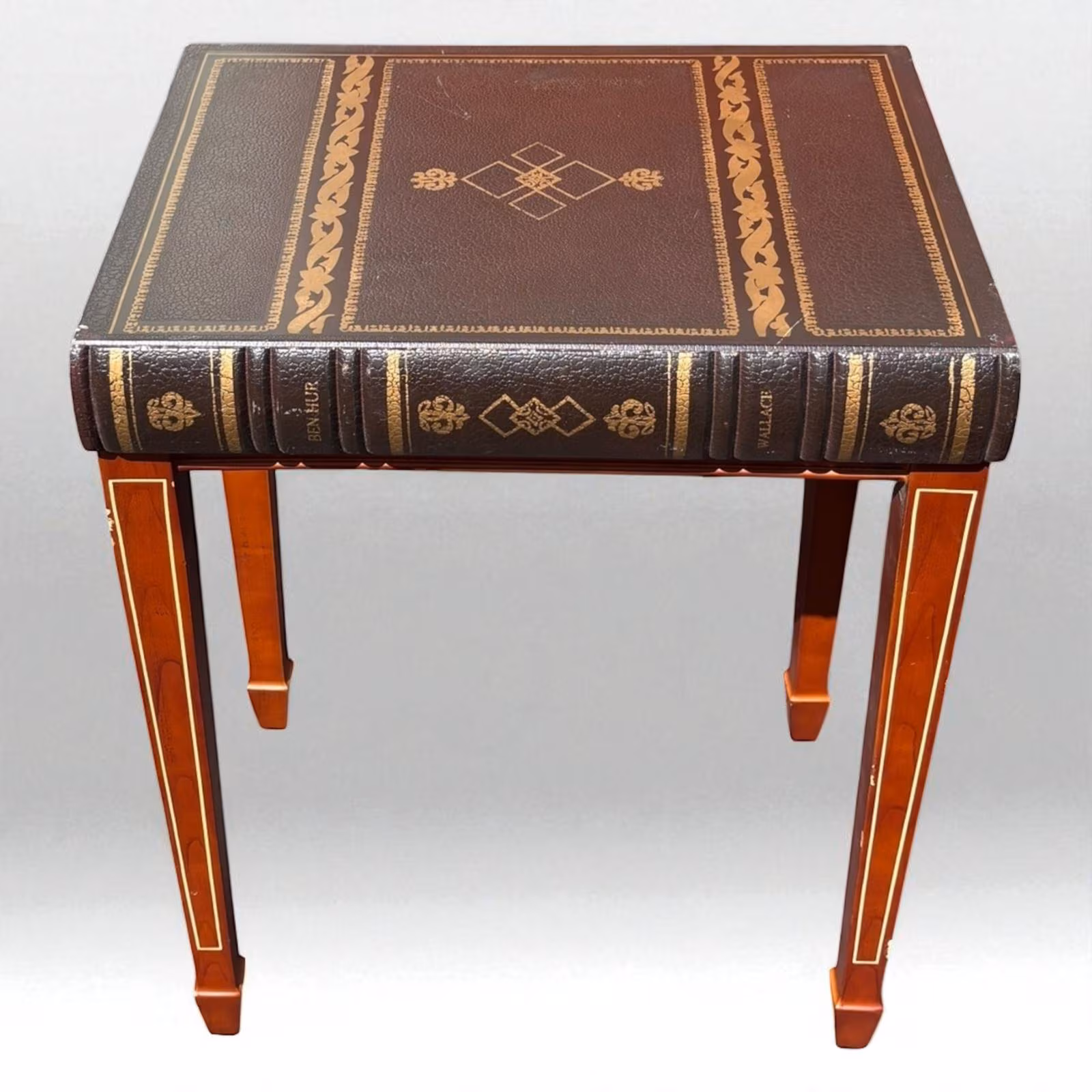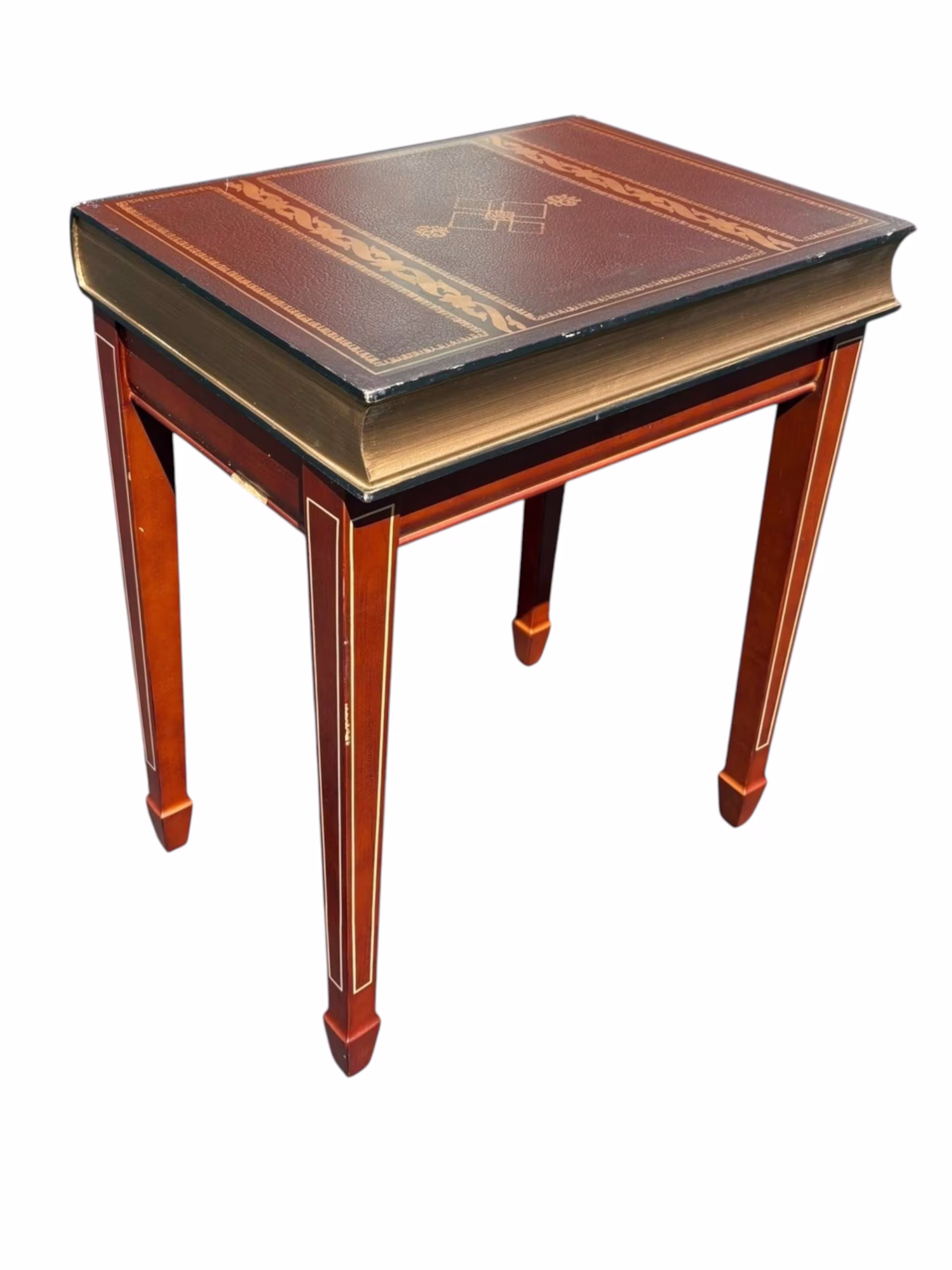 Add a touch of literary charm to your space with this unique vintage side table designed to resemble a classic leather-bound book. The tabletop features embossed detailing with a rich burgundy and gold design, giving the illusion of a finely crafted antique volume. There are some scratches throughout the sides and legs. Please look carefully at the photos.