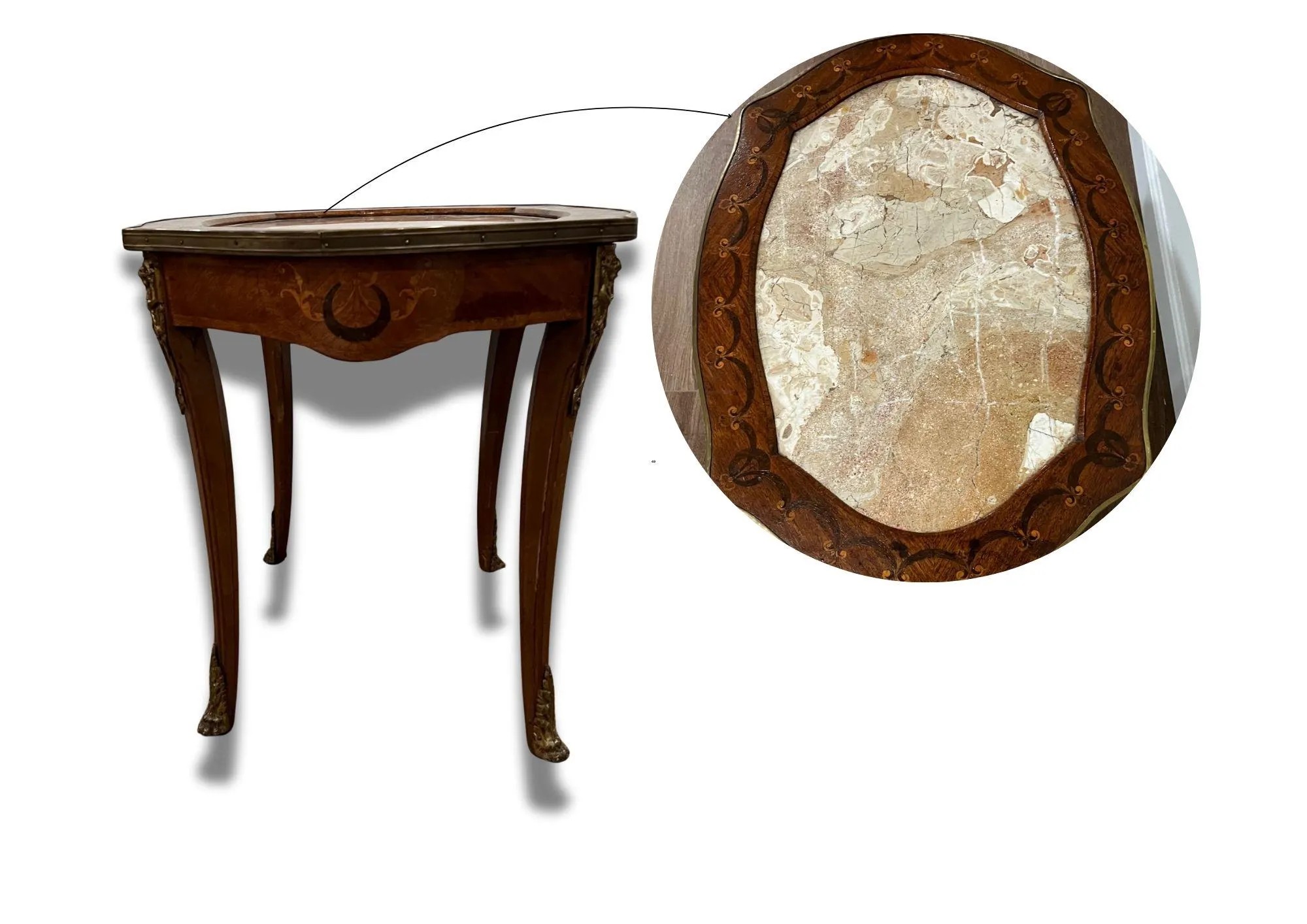 This lovely oval marquetry coffee table has a beautiful marble top. There are brass ornaments on the feet and around the top to frame it. It is walnut with satin wood inlays. In great condition. 1930?s